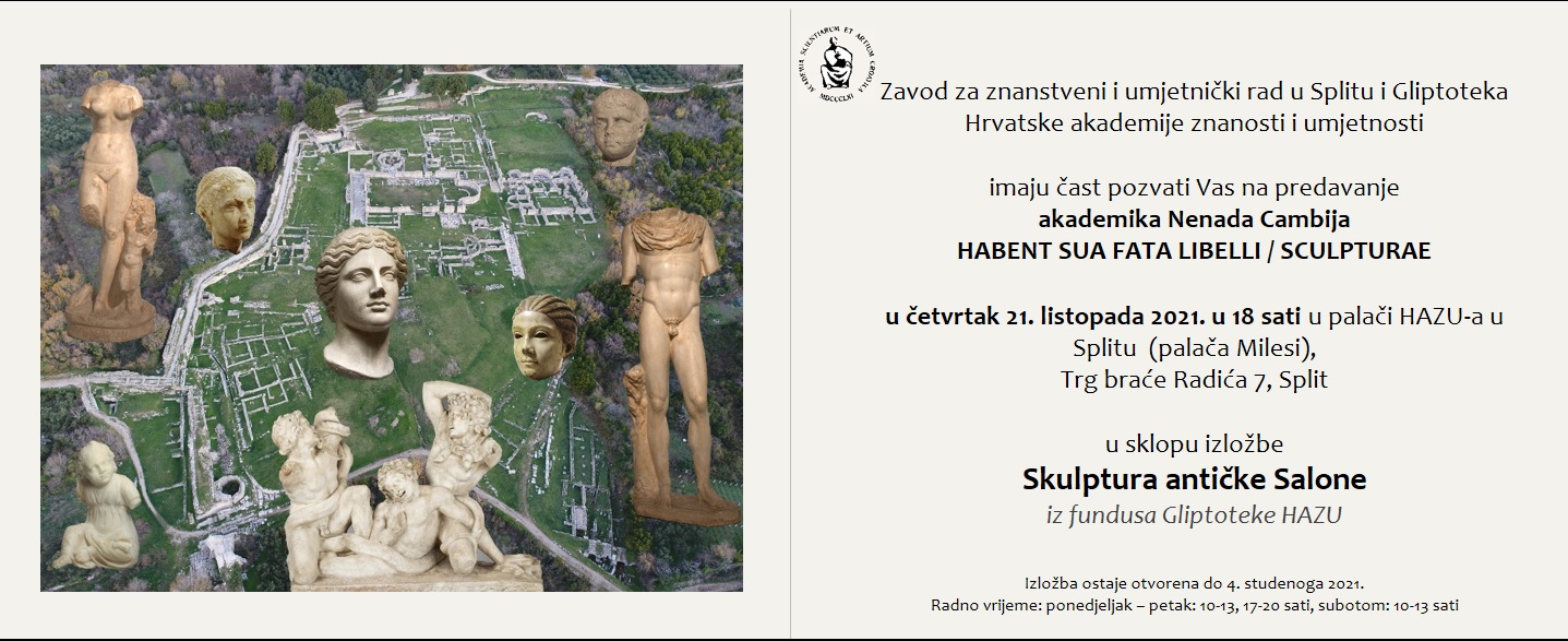 Zavod za znanstveni i umjetnički rad u Splitu i Gliptoteka Hrvatske akademije znanosti i umjetnosti imaju čast pozvati Vas na predavanje akademika Nenada Cambija: HABENT SUA FATA LIBELLI / SCULPTURAE u četvrtak 21. listopada 2021. u 18 sati u palači HAZU-a u Splitu (palača Milesi), Trg braće Radića 7, Split Predavanje se održava u sklopu izložbe: Skulptura antičke Salone iz fundusa Gliptoteke HAZU